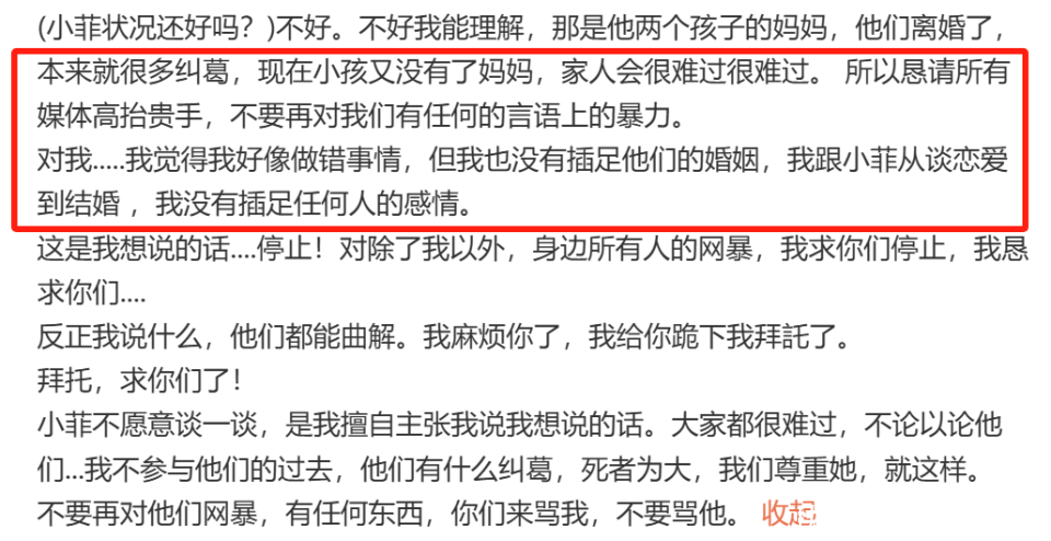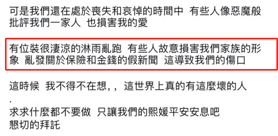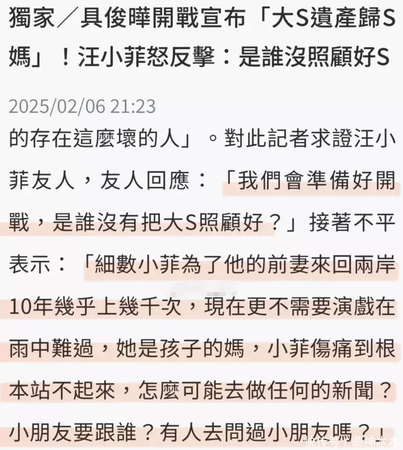 最后还是想说,大S的遗产归属和儿女抚养权肯定是关键,可无论是S家还是汪小菲方,如果真的想要解决问题,不应该急于在网上互相喊话,而是要拿出诚意来协商。不然的话,双方只会深陷互相扯头花的悲剧中,而且对儿女又会带来进一步的伤害。
