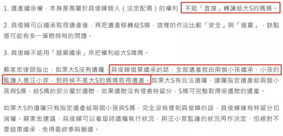 好了,如今除了汪小菲,小S、S妈、具俊晔全都分别表明立场,就连毫不相干的张颖颖和马筱梅也都趁乱发声了,而汪小菲依旧保持沉默。不过,尽管好友帮忙澄清,强调汪小菲现在忙着伤心,对大S的遗产分配没有太大的想法,可就算具俊晔把遗产继承权转移给了S妈,可从法律角度来看不太可取。